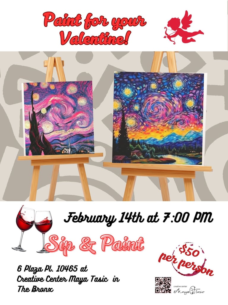 Join us for Valentine Sip and Paint night February 14th, at 7 PM, guided by our talented teacher, Maya Tasic.